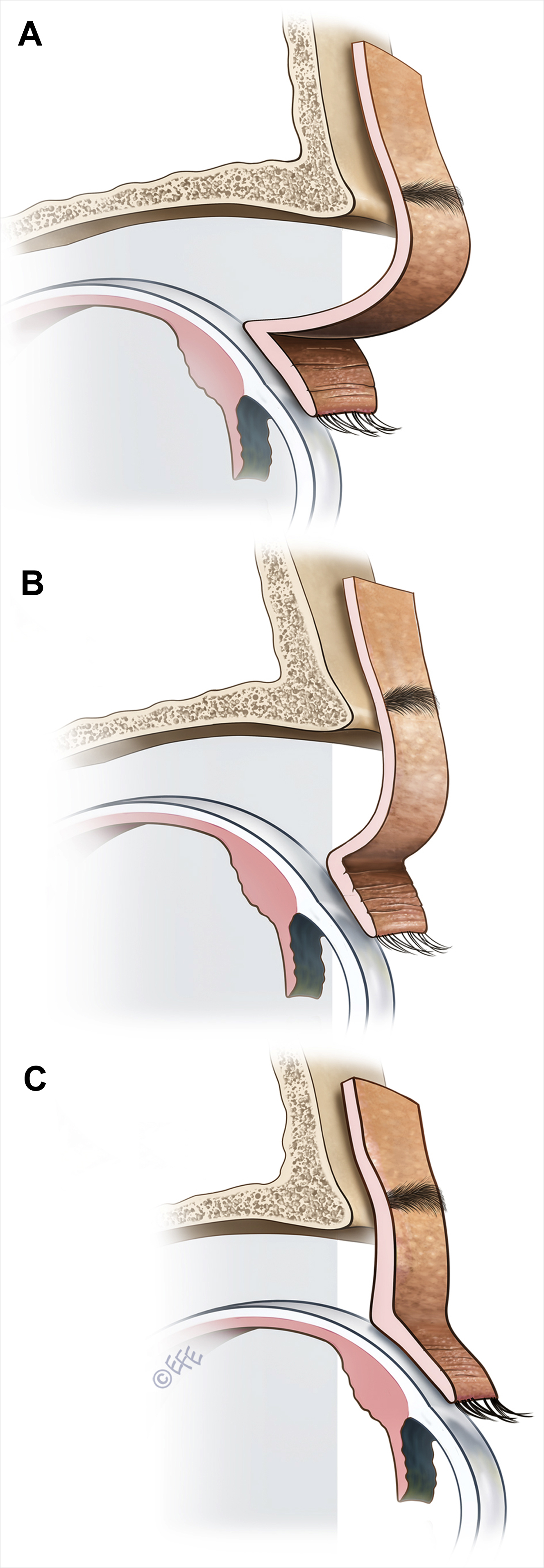 Compared with a traditional blepharoplasty a considerably smaller amount of skin is resected as skin tension is to be avoided.