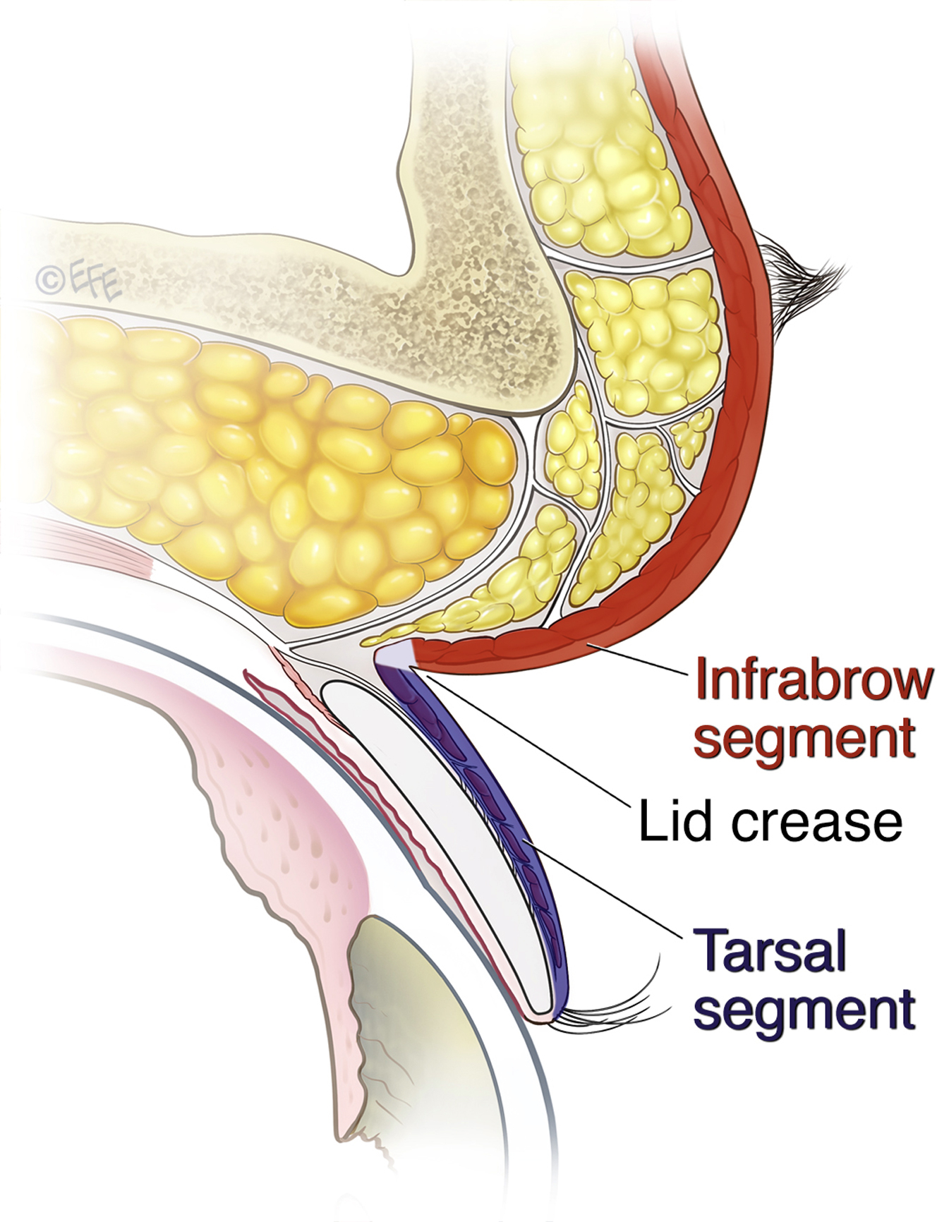 Although the lid is considered a single entity, it is structured of 2 segments that are anatomically separated by the lid crease ( Fig. 3 ). These are the lid proper, the lower part, the tarsal segment , and above that, the infrabrow segment . The lid fold is the lower part of the infrabrow segment that tends to hang over and conceal the lid crease to a varying degree. The lid fold varies considerably according to race, it may even be absent, and its variation over time is such that it ages a person. Hence, management of an excess lid fold is the usual surgery of upper lid blepharoplasty. Although interrelated, the 2 segments are visually and functionally separate. The hidden crease, with its function of internal fixation influences the appearance of the lid by balancing the 2 lid segments. Unfortunately, there is some confused terminology in some quarters; the terms “crease” and “fold” are confused as if they are the same thing. The crease is an inversion, which cannot be filled, and the fold is the opposite.