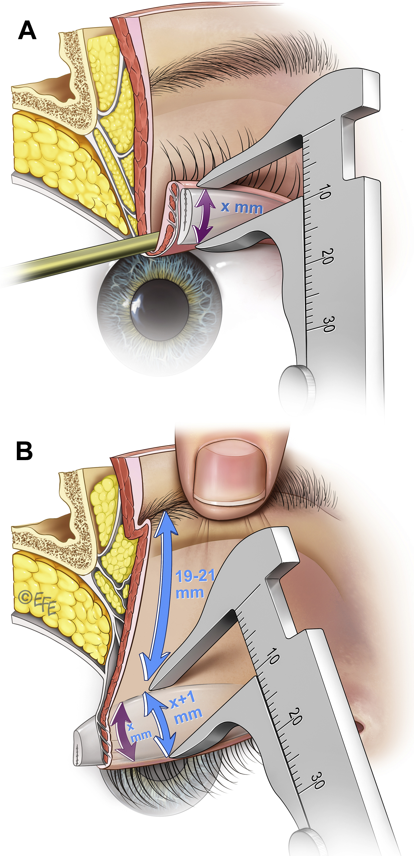 The upper marking of the excision is challenging, as it requires judgment. It is located in reference to the patient’s brow position, being placed lower (less skin excision) if more skin needs to be retained due to inherently high and/or forward projecting brows. The usual distance is within the range, 17 to 21 mm, which according to standard excisional only blepharoplasty is not removing sufficient skin. More skin must be retained for the skin inversion of the tarsal fixation. This skin is “released” during lid closure, which prevents lagophthalmos.