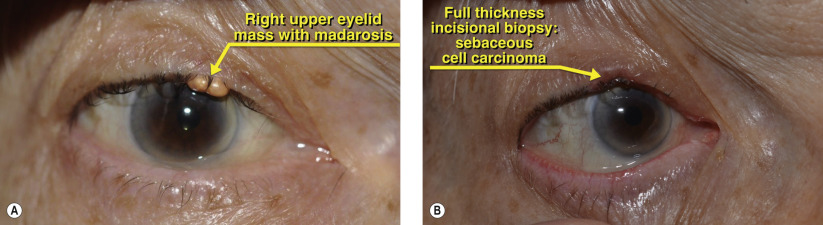 This 82-year-old man was referred with a non-resolving chalazion of the right upper eyelid. On examination, the lesion appeared as a firm, yellow mass disrupting the eyelid margin and with associated madarosis ( Figure 43.1 ). A full-thickness biopsy of the lesion revealed sebaceous cell carcinoma ( Figure 43.2 ). Sebaceous cell carcinoma occurs more frequently on the upper eyelid and presents classically as chronic unilateral blepharitis or chalazion, as in this case.