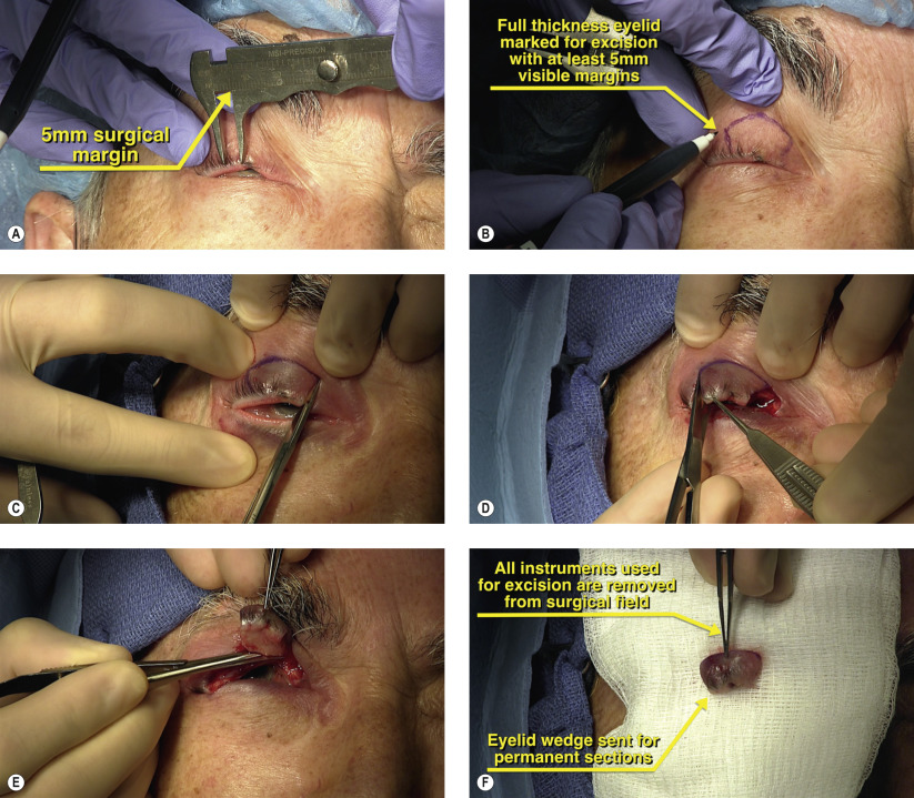 For sebaceous cell carcinoma and melanoma of the eyelid and periorbita, a surgical margin of at least 5 mm should be obtained ( Figure 43.2A ). Vertically, the entire tarsal plate should be removed also with a margin of at least 5 mm ( Figure 43.2B ). The vertical eyelid incisions are made with sharp iris scissors ( Figures 43.2C and 43.2D ). At the superior tarsal border, the incision is made with Westcott scissors to remove the entire eyelid wedge ( Figure 43.2E ). The tissue is then placed in formalin for permanent section and all instruments used during the excision are removed from the surgical field to prevent tumor dissemination ( Figure 43.2F ).