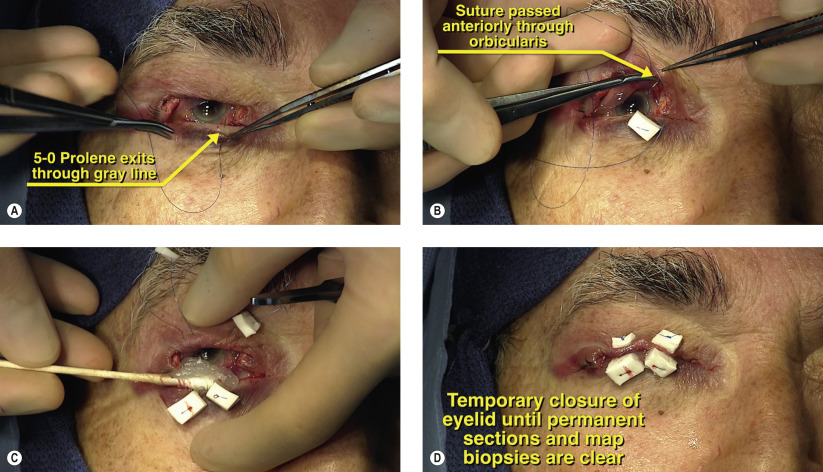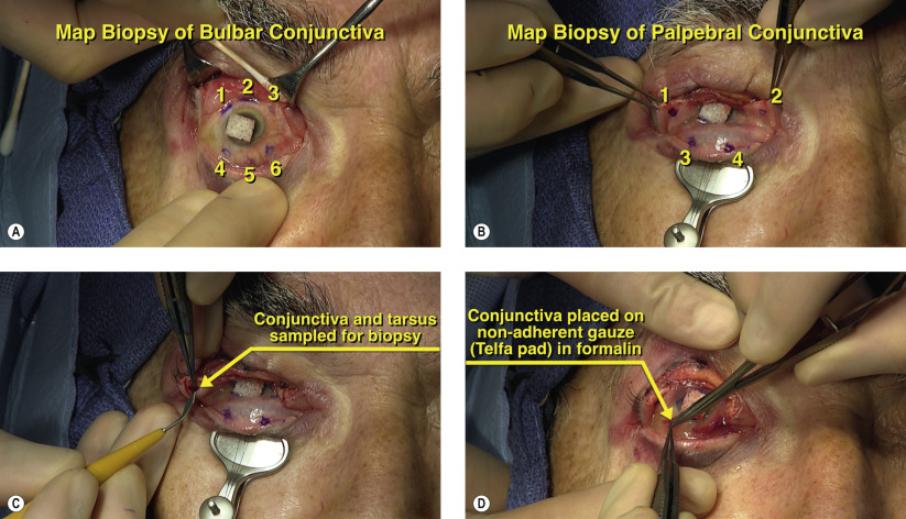 Sebaceous cell carcinoma can exhibit Pagetoid or skip lesions with intervening normal areas of tissue. Map biopsies of the conjunctiva survey the entire ocular surface to determine if local metastasis is present. The bulbar conjunctiva is sampled at six areas around the limbus, as shown in Figure 43.3A . The palpebral conjunctiva and tarsus are sampled at four areas, as shown in Figures 43.3B and 43.3C . Each individual specimen can be sent in a separate formalin container wrapped in non-absorbable gauze (Telfa pad) or placed on a sterile sheet of cardboard with the surgical margins marked ( Figure 43.3D ). All margins should be sent for rush paraffin-embedded permanent sections. Frozen sections are not sufficient to rule out residual tumor in either sebaceous cell carcinoma or melanoma.