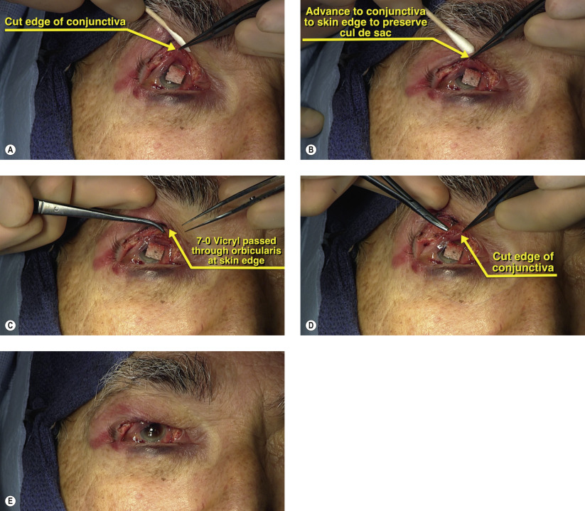 The cut edge of the conjunctiva is identified and this is advanced to the skin edge to preserve the cul-de-sac during reconstruction ( Figures 43.4A and 43.4B ). Interrupted 7-0 Vicryl sutures are used to advance the conjunctiva to prevent retraction deep into the fornix during the postoperative period ( Figures 43.4C and 43.4D ). Examination of the upper eyelid shows a greater than 80% defect ( Figure 43.4E ). Once all margins have been cleared by permanent sections, the upper eyelid can be reconstructed. If the margins are positive, a wider excision is performed with repeat permanent sections.