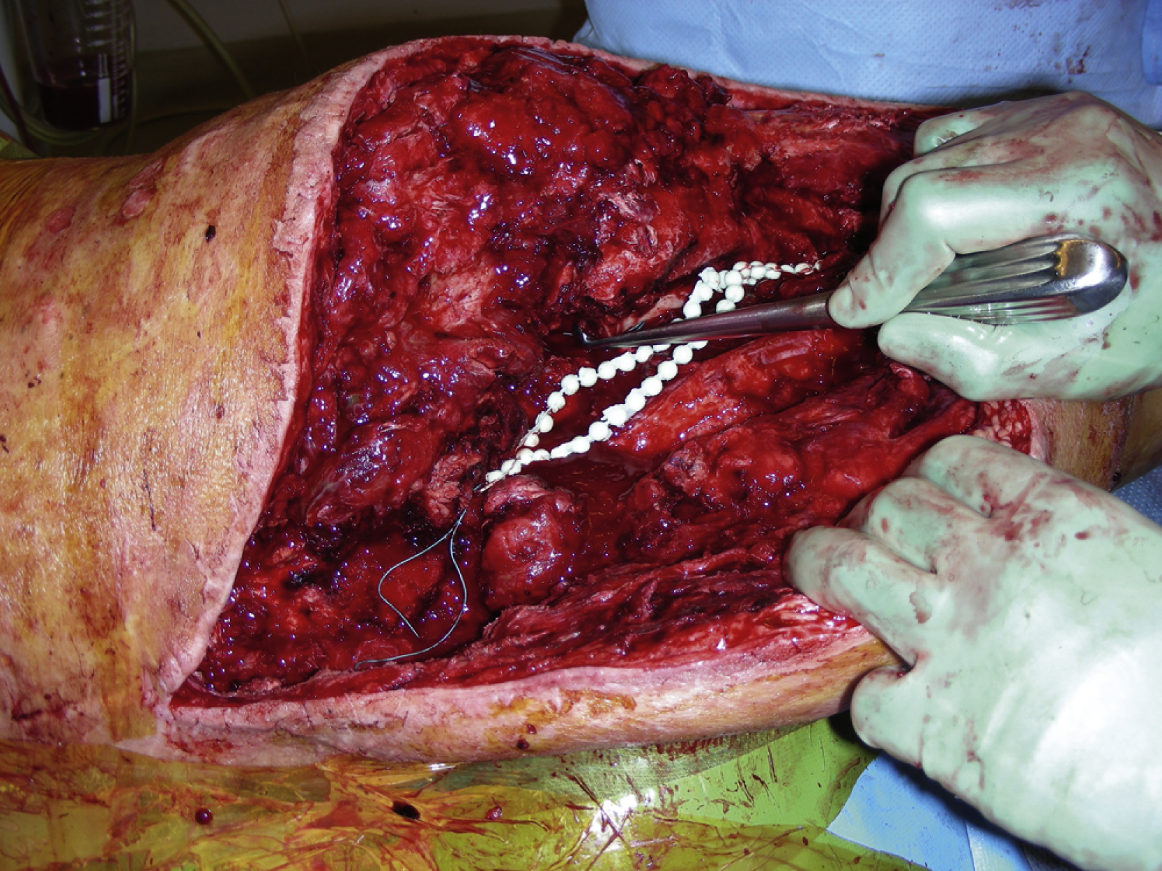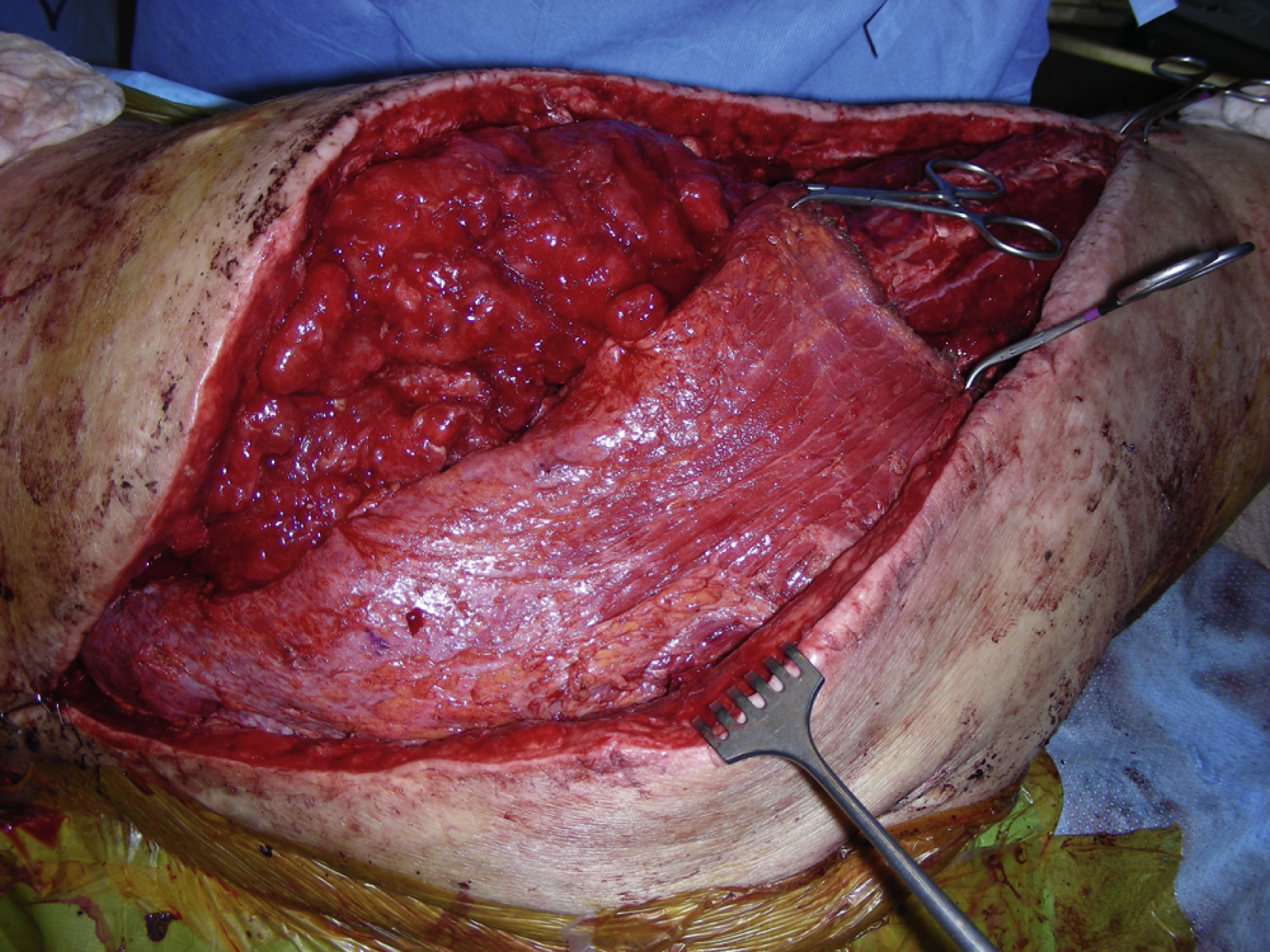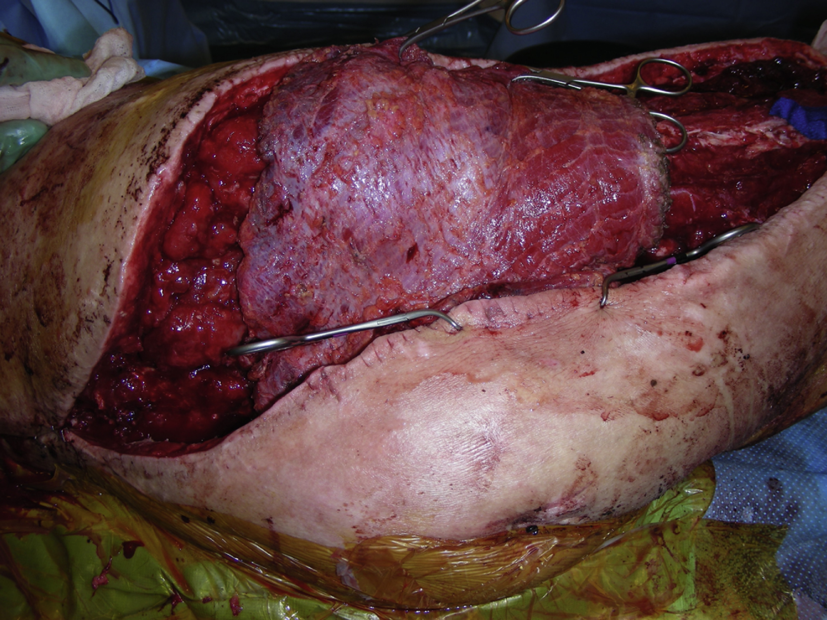 At this point, the orthopedic trauma service performed the right total hip replacement with prosthesis while the flap was temporarily placed near the area. The right total hip replacement was completed by the primary service. Because of the skin condition and the amount of swelling, it was initially impossible to close the right hip wound. Therefore, the intraoperative decision was made to place the muscle flap to cover the entire prosthesis and the hip wound ( Fig. 40.8 ). The muscle flap was inserted into the entire wound with 2-0 PDS sutures in a figure-of-eight. The most proximal part of the hip wound and the distal part of the thigh wound were approximated temporarily with towel clips. The skin edge was sutured to the surface of the muscle flap ( Fig. 40.9 ). The split-thickness skin graft was harvested from the right lateral thigh. The skin graft was meshed to 1:1.5 ratio and placed over almost the entire muscle flap and secured with skin staples. The muscle flap appeared to be well perfused and viable at the end of the procedure ( Fig. 40.10 ). The rest of the skin incision was closed in two layers. The deep dermal layer was approximated with several interrupted 2-0 PDS sutures. The skin was closed with either skin staples or 3-0 nylon in a mattress fashion. A large vacuum-assisted closure sponge dressing was placed over the skin graft site and connected with a machine.