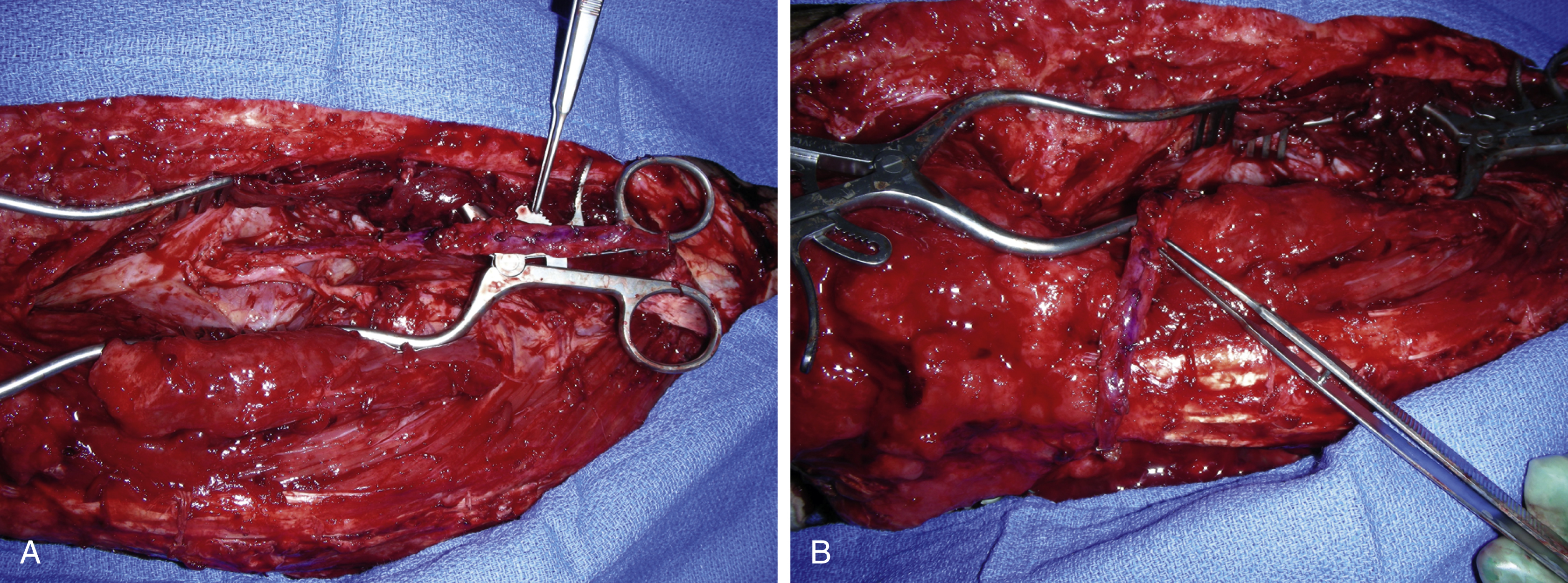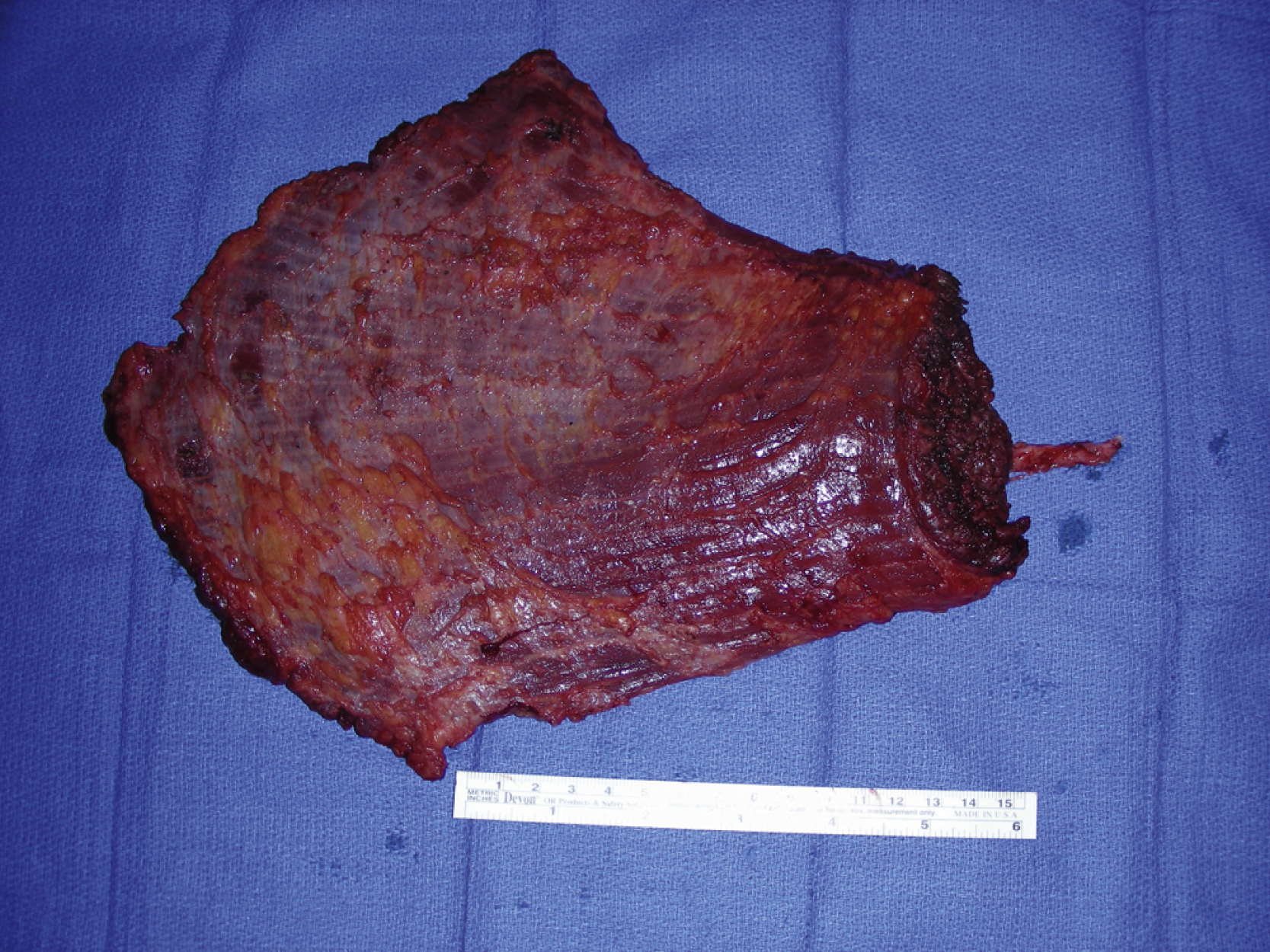 The right latissimus dorsi muscle was harvested next. An oblique incision was made down to the latissimus dorsi muscle fascia. Once both medial and lateral borders of the latissimus muscle were identified, the muscle was divided with electrocautery medially, inferiorly, and laterally. Under direct vision, the latissimus dorsi muscle was elevated from the chest wall, but the serratus muscle was left intact. After division of the serratus branch of the artery, the latissimus dorsi muscle attachment to the humerus was divided with electrocautery. The pedicle dissection was performed under direct vision with proper retraction. The thoracodorsal nerve was divided first and both thoracodorsal artery and vein were then divided after further pedicle dissection ( Fig. 40.5 ).