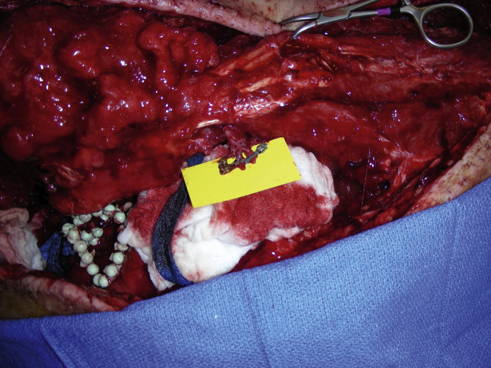 A 40-year-old White male had a very complicated injury to his right hip and lateral thigh regions with a pelvic fracture and extensive muscle necrosis over his right hip region as a result of a motor vehicle accident. He unfortunately developed heterotopic ossification requiring resection of the head of the right femur. A definitive treatment plan, proposed by the orthopedic trauma service, was to perform right total hip replacement as soon as possible after additional bony debridement. However, because of lack of good soft tissue and the poor skin quality secondary to the heterotopic ossification and the frequent surgeries in the area ( Fig. 40.1 ), the primary service felt that it would be critical to obtain better soft tissue coverage to the area immediately after the total hip replacement. The plastic surgery service was consulted to provide reliable soft tissue coverage for the potential right hip prosthesis. Because there was no reliable local option available, a free tissue transfer would be required for this kind of soft tissue coverage. However, the lack of recipient vessels for free tissue transfer presented a real challenge because all potential recipient arteries were occluded during initial embolization to control bleeding.