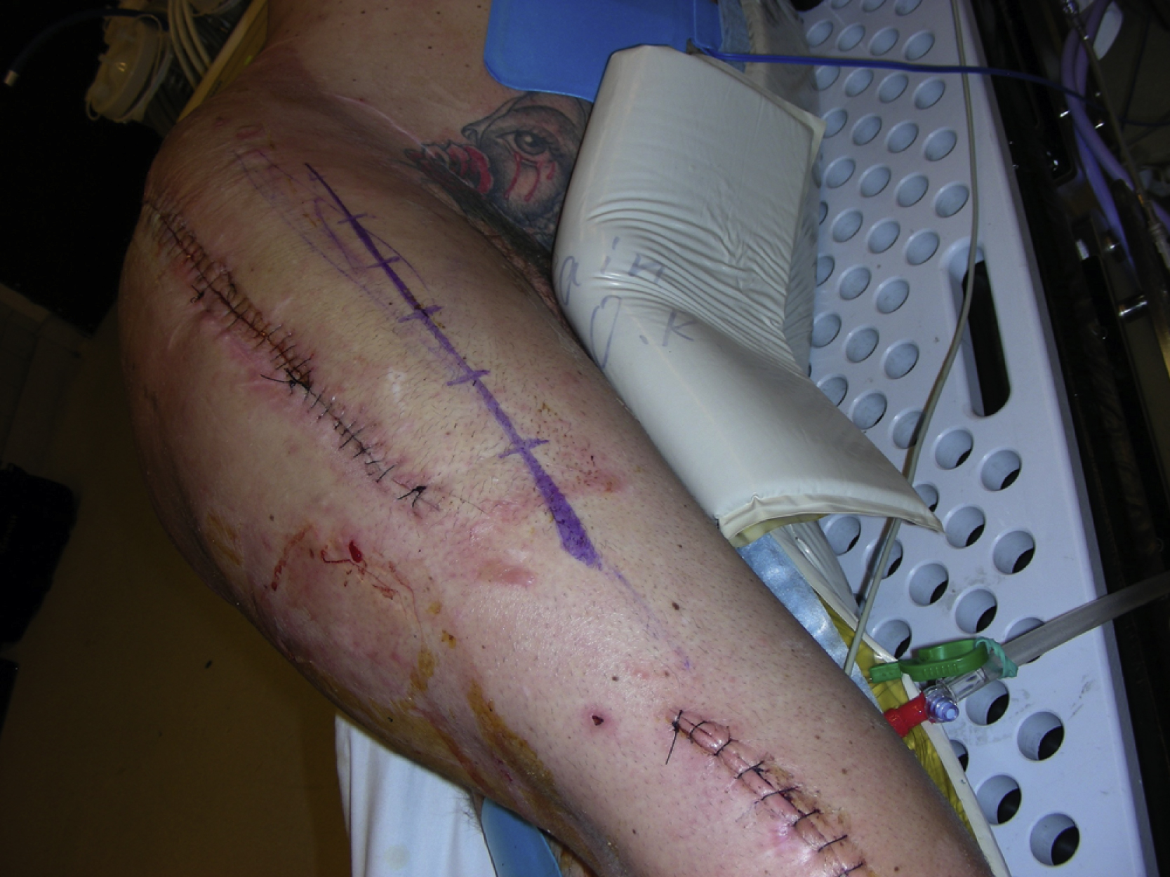 A 40-year-old White male had a very complicated injury to his right hip and lateral thigh regions with a pelvic fracture and extensive muscle necrosis over his right hip region as a result of a motor vehicle accident. He unfortunately developed heterotopic ossification requiring resection of the head of the right femur. A definitive treatment plan, proposed by the orthopedic trauma service, was to perform right total hip replacement as soon as possible after additional bony debridement. However, because of lack of good soft tissue and the poor skin quality secondary to the heterotopic ossification and the frequent surgeries in the area ( Fig. 40.1 ), the primary service felt that it would be critical to obtain better soft tissue coverage to the area immediately after the total hip replacement. The plastic surgery service was consulted to provide reliable soft tissue coverage for the potential right hip prosthesis. Because there was no reliable local option available, a free tissue transfer would be required for this kind of soft tissue coverage. However, the lack of recipient vessels for free tissue transfer presented a real challenge because all potential recipient arteries were occluded during initial embolization to control bleeding.