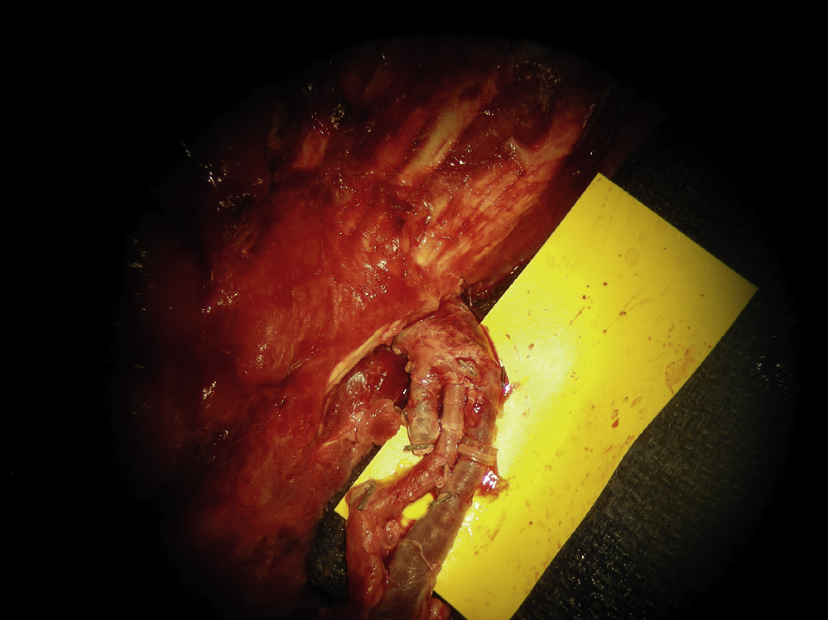 The right latissimus dorsi muscle was harvested next. An oblique incision was made down to the latissimus dorsi muscle fascia. Once both medial and lateral borders of the latissimus muscle were identified, the muscle was divided with electrocautery medially, inferiorly, and laterally. Under direct vision, the latissimus dorsi muscle was elevated from the chest wall, but the serratus muscle was left intact. After division of the serratus branch of the artery, the latissimus dorsi muscle attachment to the humerus was divided with electrocautery. The pedicle dissection was performed under direct vision with proper retraction. The thoracodorsal nerve was divided first and both thoracodorsal artery and vein were then divided after further pedicle dissection ( Fig. 40.5 ).