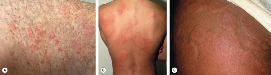 Wheals can be small ( A ) or large in size and annular ( B ), but they still retain the classic central pallor and erythematous flare. C Occasionally, more uniform edematous plaques are seen.