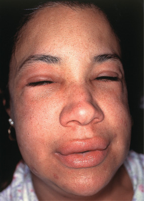 The swelling is deeper than wheals and may affect mucosal surfaces. Note the swelling of the lips and periorbital region and the lack of erythema.