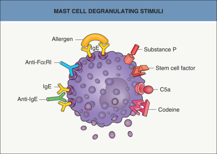 Cross-linking of two or more adjacent FcεRI on the mast cell membrane will initiate a chain of calcium- and energy-dependent steps leading to fusion of storage granules with the cell membrane and externalization of their contents. This is known as degranulation. Classic immediate hypersensitivity reactions involve binding of receptor-bound specific IgE by allergen. There are also several recognized immunologic degranulating stimuli that act through the IgE receptor, such as anti-IgE and anti-FcεRI antibodies ( Fig. 18.3 ). However, not all autoantibodies with these specificities are functional, i.e. capable of releasing histamine from mast cells or basophils in vitro . In addition, because functional anti-IgE and anti-FcεRI autoantibodies have been identified in patients with other diseases such as systemic lupus erythematosus and occasionally in healthy controls, the role of functional autoantibodies in the pathogenesis of urticaria has been debated. Non-immunologic stimuli, including opiates, C5a anaphylatoxin, stem cell factor, and some neuropeptides (e.g. substance P), can cause mast cell degranulation by binding specific receptors, independent of the FcεRI (see Fig. 18.3 ).