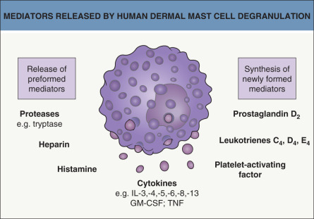 Mast cell granules contain preformed mediators of inflammation, the most important of which is histamine ( Fig. 18.4 ). A wide range of cytokines has been identified in human mast cells from different tissues, including tumor necrosis factor (TNF), interleukins (IL)-3, -5, -6, -8 and -13, and granulocyte–macrophage colony-stimulating factor (GM-CSF). Synthesis and secretion are upregulated following FcεRI stimulation. TNF is expressed constitutively in resting human cutaneous mast cells. Prostaglandins and leukotrienes are synthesized from arachidonic acid derived from cell membrane phospholipids (see Fig. 130.6 ). The most important proinflammatory eicosanoids are prostaglandin (PG) D 2 and the leukotrienes (LT) C 4 , D 4 , and E 4 (slow releasing substance of anaphylaxis). PGE 2 has inhibitory effects on immunologic mast cell degranulation and may therefore have a protective role in urticaria. Increased levels of TNF, IL-1β, -6, -10, -12p70, -13, and B-cell activating factor (BAFF) have been detected in the sera of urticaria patients .