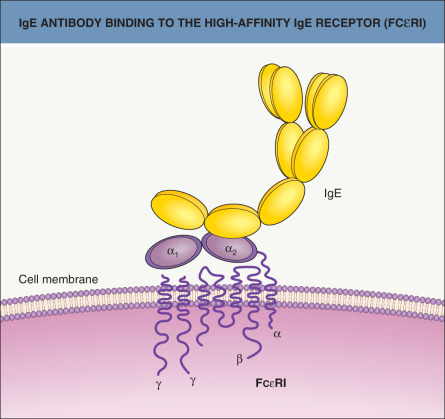 IgE antibody binding to the extracellular α subunit of the high-affinity IgE receptor (FcεRI).