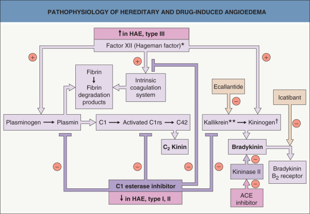 Angiotensin-converting enzyme (ACE) inhibitor-induced urticaria is believed to result from the inhibition of endogenous kininase and a subsequent increase in bradykinin. Icatibant and ecallantide have been approved for the emergency treatment of hereditary angioedema (HAE) as alternatives to C1 inh concentrate (derived from human plasma) or recombinant C1 inh (derived from milk of transgenic rabbits). Icatibant, a decapeptide, is a specific bradykinin B 2 receptor antagonist. Ecallantide, a 60-amino acid recombinant protein, selectively inhibits kallikrein. Off label, icatibant has been used to treat ACE inhibitor-induced angioedema. Two forms of C1 inh, one of which is administered intravenously and the other subcutaneously, are approved for prevention of attacks. At the time of writing, twice-monthly administration of lanadelumab, a human monoclonal antibody that inhibits plasma kallikrein, is under investigation for prevention of attacks. *The active form of factor XII (Hageman factor) is XIIa. **Kallikrein is formed from prekallikrein. High-molecular-weight.