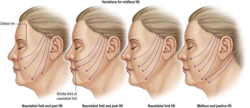 Typically, suitable candidates have more than one of the above findings. In youth, the long axis of the orbit is horizontal. With aging, the long axis rotates 90 degrees to a vertical direction. An essential finding in patients who are candidates for a midface lift is descent of the lid/cheek junction. Although this movement may be an illusion and in reality represents only a loss of soft tissue volume (Lambros’s theory), the correction, as mentioned above, may require both vector and a volume based maneuvers.