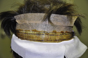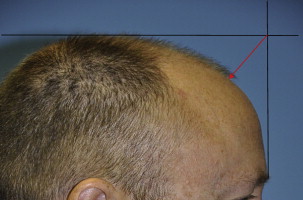Once the recipient site is designed, donor hair is harvested from the occipital scalp in the region just above the external occipital protuberance where the hair is genetically stable ( Fig. 4 ). It is in this region where the density is greatest on the scalp is most resistant to hormone-related alopecia. When evaluating the donor site, the length of the donor region can be measured from 3 cm behind the hairline at the temple to a corresponding spot on the contralateral side. The hair transplantation surgeon should always keep in mind the limited donor reservoir of good genetic hair available, which is approximately 30 × 4 cm. As a general rule of thumb, half of the donor area may be moved (in total) without a significant change in appearance. Strips measuring less than 1.5 cm in width are less likely to result in a widened scar. The amount of donor hair available is dependent on the density of hair present as well as the laxity of the scalp in the occipital area. These two factors can be compromised by injury and previous scalp surgery. If the scalp has been stretched from previous surgery, the follicular units will be spaced further apart. Scarring in the donor area will also have a significant impact on the ultimate donor yield. It is important to measure the patient’s scalp laxity and density to determine the width of the strip that can be harvested to meet the needs of the recipient site.