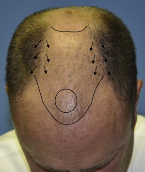 To optimally camouflage a scar in the hair-bearing scalp, it is important to understand and recreate patterns found in nature. For a male, the anterior hair line should originate where the vertical forehead changes to horizontal caudal scalp ( Fig. 1 ) approximately 8 cm above the glabella. Typically, a slightly flared line then joins the temporal hump laterally at the vertical level of the lateral canthus to create the frontal hairline contour ( Fig. 2 ). The design of the female hairline differs from that of the male in that the hairline should start at a height of approximately 5.5 cm above the glabella and frequently has a “widow’s peak” and lateral mounds. Hairline design is a topic of continual debate and discussion. Transition zones of 1-hair and 2-hair grafts are used at the hairline with 3-hair and 4-hair grafts preserved for the center of the parietal scalp. Macroirregularity and microirregularity of the grafts are also used in these transition zones to create a natural appearance. When reconstructing a scarred region in the crown, it is important to recognize the whorl patterns that occur naturally. The S-shaped pattern ( Fig. 3 ) is the most common pattern seen in Caucasian men. Designing the recipient site is the art of hair restoration. It is critical to pay close attention to the native hair as well as the patient’s preferences and styling patterns when creating the design for maximum camouflage.