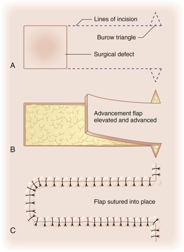 (A–C) The classic advancement flap is created by two parallel incisions. The flap is then elevated and advanced to close the surgical defect.