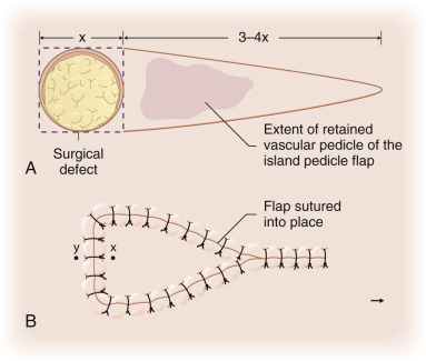 After undermining of the recipient site, the donor site, and the anterior and posterior margins of the flap, the flap and surrounding skin are elevated and hemostasis is achieved. After the achievement of adequate hemostasis, the flap is advanced in a V-Y manner to fill the surgical defect. The initial suture (the key stitch) is placed at the midpoint of the flap’s anterior margin to a corresponding point along the opposite margin of the primary surgical defect. This suture is placed with particular care to make sure that the flap is carefully aligned and thus to minimize the risk of subsequent anatomic distortion. Suture technique is critical to achieve operative success. To compensate for the inevitable wound contraction seen in the postoperative period, the flap must be sutured into place with care. Buried vertical mattress sutures of absorbable material are placed in the mid-dermis. If placed correctly, each successively placed buried suture will lower the central portion of the slightly undersized island pedicle flap. Once the buried sutures have been placed, the center of the flap should be depressed 2 to 3 mm below the surrounding skin. This slight flap recession is important to provide a well-contoured flap after wound healing has been completed, since the flap will inevitably rise to a small extent as wound contraction occurs at the flap’s bed in the early postoperative period. The author has never observed a recessed flap that failed to eventually elevate to a proper position.