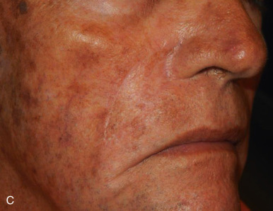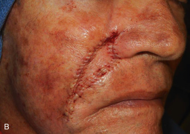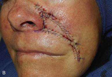 (A) A surgical defect of the paranasal cheek. (B) The defect is enlarged to the aesthetic boundary of the lateral ala and the V-Y flap is advanced medially. (C) The scar is well hidden in native anatomic boundaries.