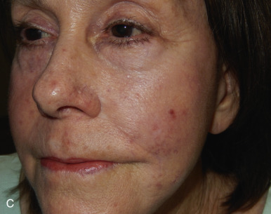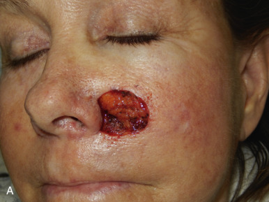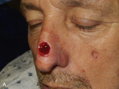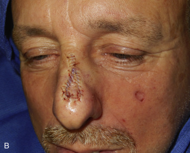 (A) Surgical defect of the supratip. (B) A V-Y flap based on a lateral pedicle with bilevel undermining is advanced into the defect and sutured in place. (C) Postoperative result with no additional procedures.