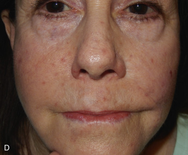 (A) A surgical defect of the medial cheek and upper lip. (B) A V-Y flap is advanced medially to fill the surgical defect. (C, D) Postoperative result. Because the central portion of the flap is not undermined, the native melo-labial fold is preserved.