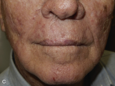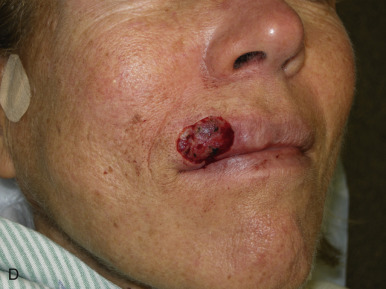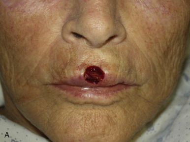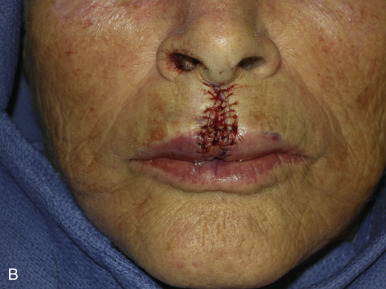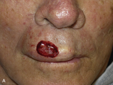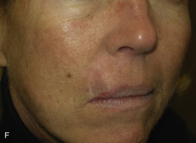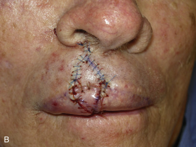 (A–C) A mid-upper lip defect repaired with opposing V-Y flaps (one for the cutaneous lip and one for the vermilion lip). (D–F) A lateral upper lip defect repaired with a cutaneous V-Y flap and mucosal advancement flap.