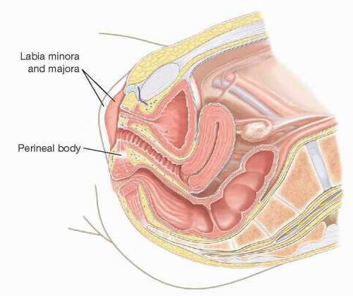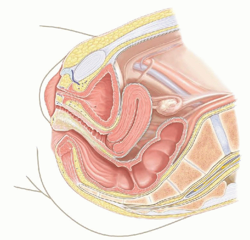 FIG 1 • Sagittal view of pelvic anatomy depicting relationship of urethra, vagina, and rectum in typical development.
