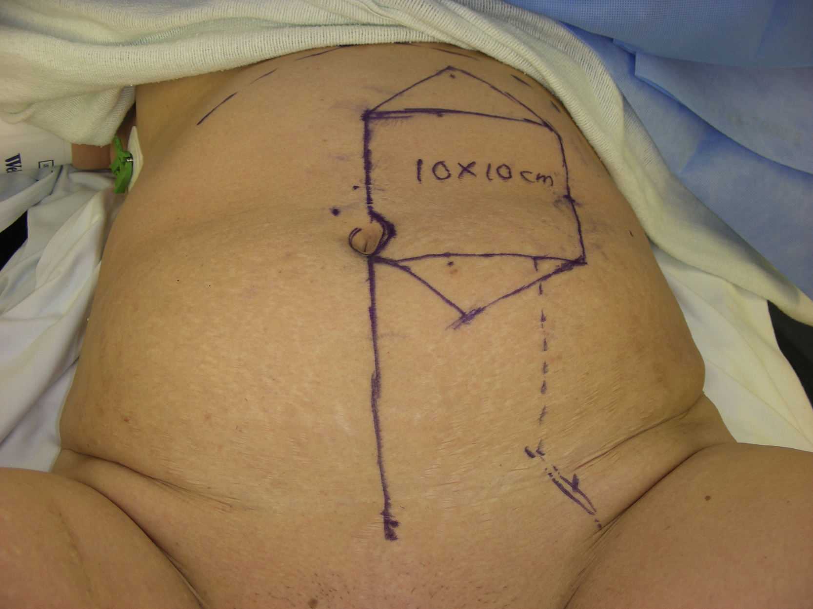 Under general anesthesia with the patient in the lithotomy position, anterior pelvic exenteration was completed by the gynecological oncology service through a midline laparotomy. After careful assessment of the left abdominal wall including the left inferior epigastric vessels, a left VRAM flap was performed as planned. Two perforators were identified with a hand-held Doppler and marked and incorporated within the skin paddle design of the flap. A 10 × 10 cm skin paddle was designed from the midline based on the pinch test and potential excess skin for the closure of the abdomenal skin defect was incorporated with the skin paddle design ( Fig. 37.2 ). The skin paddle was incised down to the anterior rectus sheath. The suprafascial dissection was performed to identify the perforators. In this way, only a small portion of the anterior rectus sheath was sacrificed during the flap elevation.