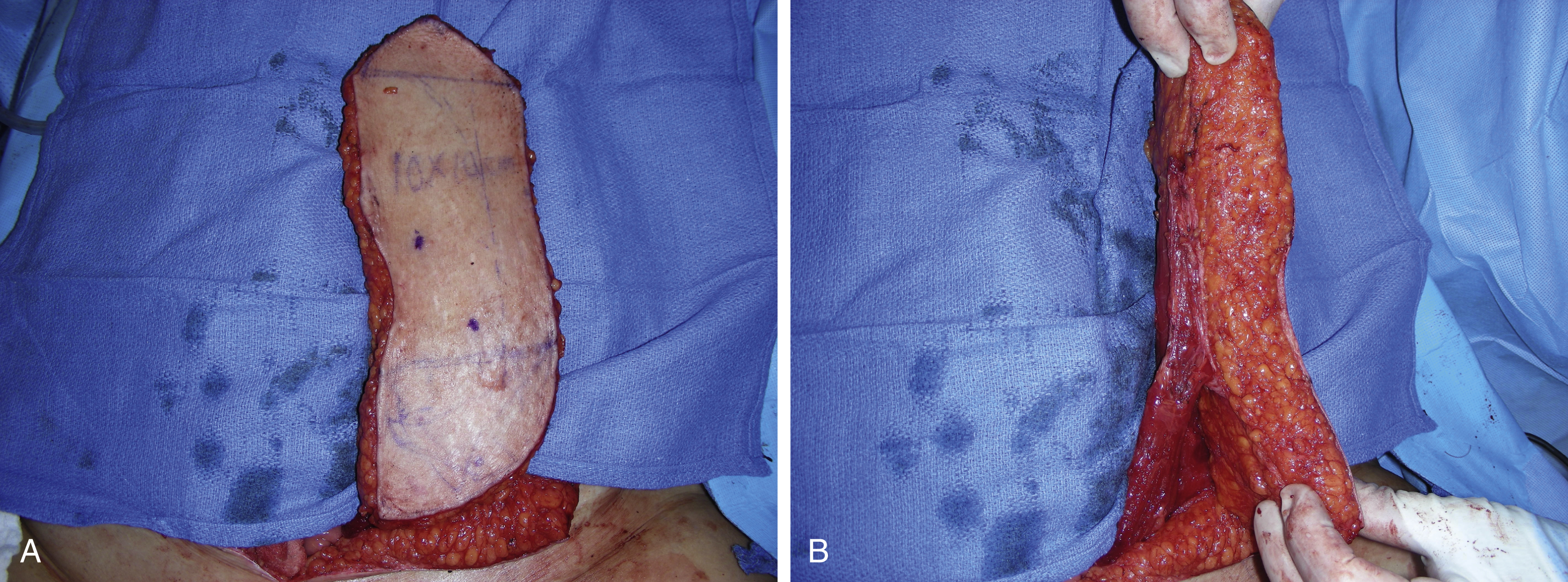 Further dissection was performed to free the muscle more proximally and the superior rectus abdominis muscle was divided with electrocautery. The muscle flap was elevated from the posterior rectus sheath. During dissection, several intercostal nerves were identified and divided with hemoclips. Inferiorly, the muscle was dissected free toward its insertion. The muscle flap was then completely elevated based on the inferior epigastric vessels ( Fig. 37.3 A ). The anterior rectus sheath was tacked to the subcutaneous tissue with 3-0 Vicryl sutures to prevent shear force ( Fig. 37.3 B). The pedicle dissection was performed within the pelvis under direct vision. The entire flap was easily turned over and tunneled through the pelvic cavity and brought out in the perineal opening without any tension.