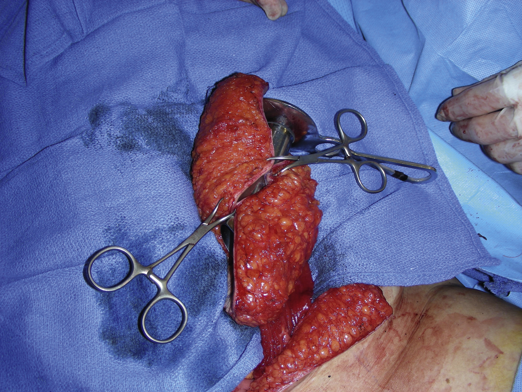 Under general anesthesia with the patient in the lithotomy position, anterior pelvic exenteration was completed by the gynecological oncology service through a midline laparotomy. After careful assessment of the left abdominal wall including the left inferior epigastric vessels, a left VRAM flap was performed as planned. Two perforators were identified with a hand-held Doppler and marked and incorporated within the skin paddle design of the flap. A 10 × 10 cm skin paddle was designed from the midline based on the pinch test and potential excess skin for the closure of the abdomenal skin defect was incorporated with the skin paddle design ( Fig. 37.2 ). The skin paddle was incised down to the anterior rectus sheath. The suprafascial dissection was performed to identify the perforators. In this way, only a small portion of the anterior rectus sheath was sacrificed during the flap elevation.