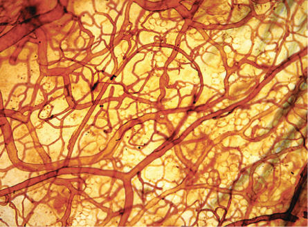 When angioblasts form a lumen, they become endothelial cells with a polarized phenotype and production of a basal lamina. Interactions of integrin receptors on the endothelial surface with the basement membrane are of paramount importance for the formation of the primordial vascular plexus, and establishment of interendothelial adherence junctions requires the vascular endothelial (VE)-cadherin. The early vascular system consists of sinusoidal capillaries that are arranged in a polygonal honeycomb pattern (see Fig. 102.6 ). The primordial vascular plexus then becomes surrounded by mesenchymal cells that give rise to pericytes and vascular smooth muscle cells. In a next step, under the influence of VEGF-A, angiopoietins and ephrins, profound remodeling of the primordial vascular plexus takes place (see below). Remodeling involves both the formation and the regression of blood vessels and apoptosis of vascular endothelial cells.