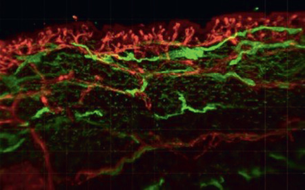 The blood vessels stain positively for von Willebrand factor (red) while the lymphatic vessels stain positively for LYVE-1 (green). Multiple capillary loops are seen in the dermal papillae (top).