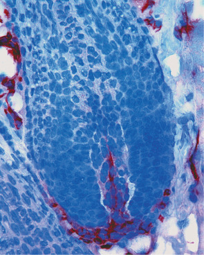 Several markers are utilized for immunohistochemical staining of blood vascular endothelial cells ( Table 102.1 ). In normal human skin, the most specific markers for cutaneous blood vessels appear to be von Willebrand factor (see Fig. 102.3 ), CD34, and PV-1 (plasmalemma vesicle-associated protein-1); the latter is recognized by the PAL-E (Pathologische Anatomie Leiden-Endothelium) antibody. Double immunofluorescence stains for the pan-endothelial cell marker CD31 (PECAM-1) plus the lymphatic vessel endothelium-specific hyaluronan receptor LYVE-1 or the glycoprotein podoplanin (recognized by the widely used D2-40 antibody) also allow for the selective visualization of LYVE-1-negative (or podoplanin-negative), CD31-positive blood vessels in the skin. As a result, blood vessels can be distinguished from lymphatic vessels (see Fig. 102.15 ).