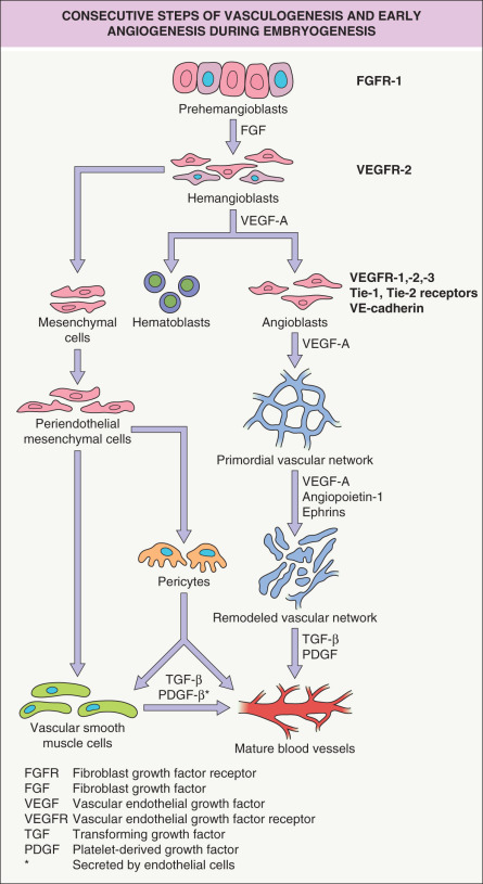 During embryogenesis, the first blood vessels are formed through vasculogenesis , the differentiation of undifferentiated angioblasts into endothelial cells that form a primitive vascular network. Angioblasts originate from blood islands in the extraembryonic mesoderm of the yolk sac. Blood islands are clusters of epithelioid cells; the outer cells differentiate into angioblasts, whereas the inner cells differentiate into primitive hematopoietic cells, suggesting that both cell types originate from a common embryonic precursor cell, the hemangioblast; the latter is formed from earlier precursor cells under the influence of fibroblast growth factors (FGFs) ( Fig. 102.6 ). Hemangioblasts already express the high-affinity receptor for vascular endothelial growth factor-A (VEGF-A), vascular endothelial growth factor receptor-2 (VEGFR-2; KDR [human]; Flk-1 [murine]).