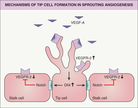 Angiogenesis , the sprouting of new blood vessels from existing primordial vessels, represents the major mechanism for new blood vessel formation . During this process, specialized endothelial cells, so-called tip cells, extend filopodia and sense the environment for guidance cues such as VEGF-A ( Fig. 102.7 ). Tip cells are followed by stalk cells which extend the sprout by proliferation and form a lumen . Tip cells can connect with neighboring tip cells to form new vascular branches . The specification of tip and stalk cells is regulated by Notch signaling. Activation of VEGFR-2 on tip cells by VEGF-A results in increased expression of the Notch ligand Delta-like 4 (Dll4); the latter binds to Notch expressed on neighboring stalk cells. Notch signaling in stalk cells leads to reduced VEGFR-2 expression, rendering these cells less responsive to VEGF-A (see Fig. 102.7 ). This is a highly dynamic process in which endothelial cells compete for the tip cell position . Recent findings have shown that glycolysis plays an additional important role in the regulation of vascular sprouting, in parallel with genetic cues .