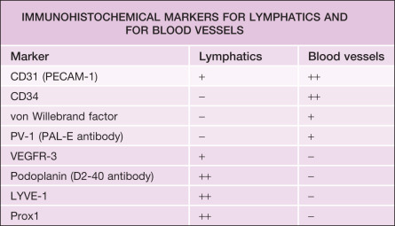 Immunohistochemical markers for lymphatics and for blood vessels.