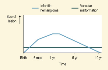According to this classification system ( Box 12-1 ), vascular birthmarks are divided into the categories of tumors and malformations. Vascular tumors are neoplasms of the vasculature. This category includes hemangioma of infancy (the most common vascular tumor), kaposiform hemangioendothelioma (KHE), tufted angioma, and pyogenic granuloma (PG). Vascular malformations represent anomalous blood vessels without any endothelial proliferation or cellular turnover. In distinction to infantile hemangioma (IH), these lesions tend to be present immediately at birth and persist for a lifetime. Vascular malformations are further classified according to their predominant components, i.e., capillary malformation (port wine stain [PWS], salmon patch), venous malformation (VM), lymphatic malformation (LM), and arteriovenous malformation (AVM). Figure 12-1 pictorially demonstrates the different natural histories of IHs and vascular malformations.