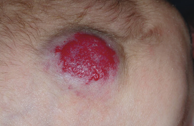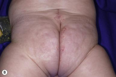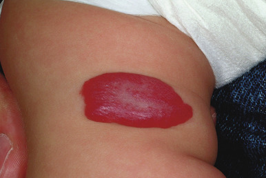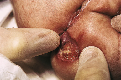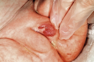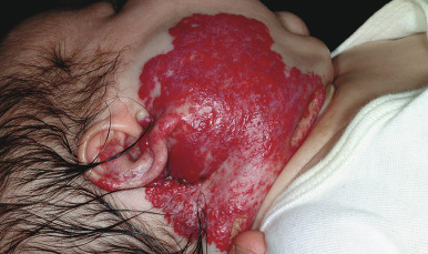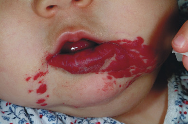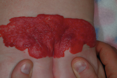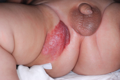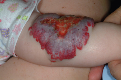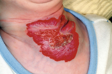 Ulcerated IH deserves special mention, as this is the most common complication in these lesions, occurring in up to 16% of patients. Ulceration usually occurs during the proliferative phase ( Fig. 12-23 ) and is especially common in areas of recurrent trauma such as the lips ( Fig. 12-24 ), genitals ( Fig. 12-25 ), perineum/perianal region, or in moist intertriginous sites such as the neck ( Fig. 12-26 ). Tissue breakdown results in bleeding, secondary infection, pain, and permanent scarring. Local wound care with compresses, topical antibiotics (i.e., bacitracin, mupirocin, or metronidazole), and nonstick wound dressings (i.e., petrolatum-impregnated gauze) are useful. Oral antibiotics should be considered if persistent or deep ulceration, drainage, or exudate is present and should be guided by the results of culture and sensitivity testing. Pain management with acetaminophen or acetaminophen with codeine may be indicated. Topical lidocaine may be helpful for pain control but should be used with extreme caution given the risks of absorption and possible systemic toxicity. Becaplermin gel, a recombinant human platelet-derived growth factor approved for topical therapy of lower-extremity diabetic neuropathic ulcers in patients 16 years of age and older, has been used off-label for the treatment of ulcerated IH with good success. Ulcerated IHs that do not improve with the above treatments usually warrant systemic therapy.