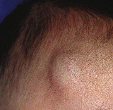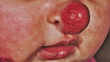 Hemangiomas may occur as superficial, deep, or mixed lesions representing their soft-tissue depth. The clinical appearance of the lesion depends on the type of hemangioma present. Superficial IHs, when well formed, present as bright red to scarlet, dome-shaped to plaque-like to lobulated papules, plaques, and nodules ( Figs. 12-2 through 12-6 ). They may partially blanch with pressure and are rubbery or noncompressible on palpation. Deep IHs usually present as subcutaneous, partially compressible nodules and tumors, often with an overlying blue hue, prominent venous network, or telangiectasias ( Figs. 12-7 through 12-9 ). These lesions may be warm to palpation. Combined IHs have both a superficial component and a deep component and occur in up to 25% to 30% of patients. They present with both the superficial, bright red component and a deeper, blue nodular component ( Figs. 12-10 and 12-11 ). Hemangiomas may also be divided into subtypes based on their anatomic configuration. Focal lesions are discrete, usually round lesions that appear to arise from a single focal point. Segmental lesions (see below) involve a more broad anatomic unit that may be determined by embryonic placodes. Indeterminate lesions are difficult to classify into one of the preceding two subtypes.