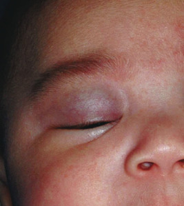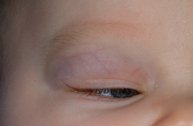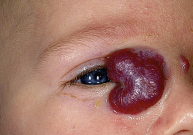 Hemangiomas in certain locations may suggest a higher probability of complications or associated findings. Hemangiomas involving various portions of the face may be quite problematic. Periorbital IHs may be relatively insignificant when small, but larger lesions ( Fig. 12-27 ) may result in a variety of ocular complications. In addition, any periorbital IH may be indicative of deeper, retrobulbar involvement, which may or may not present with unilateral proptosis. Light-deprivation amblyopia may result from visual axis obstruction, most commonly in the setting of significant upper eyelid lesions that result in mechanical ptosis ( Fig. 12-28 ). Astigmatism may occur if the IH compresses the globe and may result in permanent amblyopia. Rarely, IH situated near a tear duct may block the drainage system and result in matting and conjunctivitis. Because of these concerns, any child with a periorbital IH should undergo ophthalmologic examination. If there are functional or anatomic ophthalmologic concerns, systemic therapy is usually indicated.