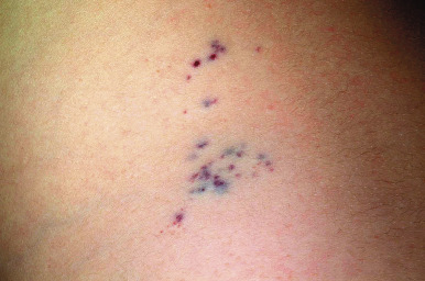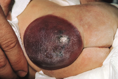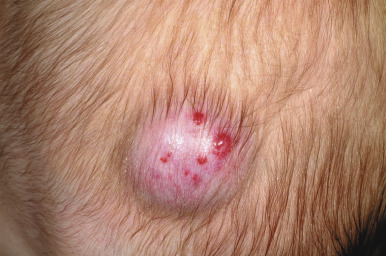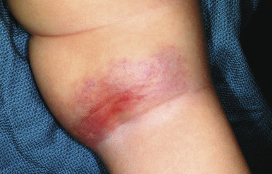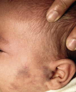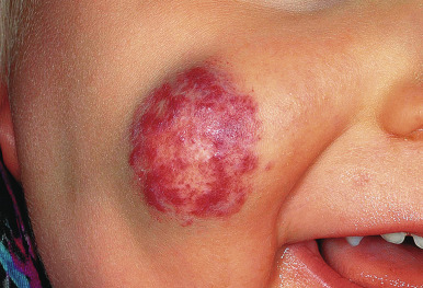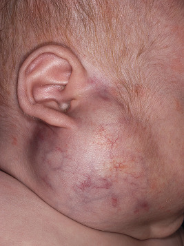 Hemangiomas may present with a variety of precursor lesions, and in up to 50% of affected infants these premonitory marks may be evident at birth. They include areas of telangiectasias ( Fig. 12-12 ), pallor, ecchymotic macules ( Fig. 12-13 ), and even ulceration ( Figs. 12-14 and 12-15 ). Fully formed IHs may occasionally present at birth and are termed congenital hemangiomas. These lesions are discussed in more detail later.