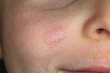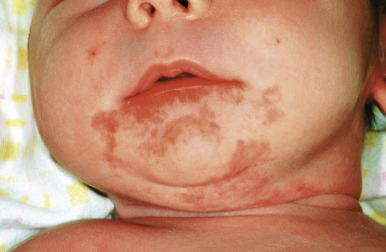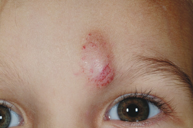 No treatment is usually necessary for salmon patches, because 95% of facial lesions fade within the first 1 to 2 years of life. Lesions on the posterior neck or scalp (also known as Unna nevus ) may fade, although some of these persist indefinitely. Since they are usually covered by hair, these lesions do not typically pose a cosmetic problem. Parents should be educated regarding the common finding of “reappearance” or accentuation of facial lesions during episodes of crying, breath-holding, straining with defecation, or physical exertion.