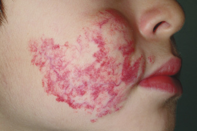 Nevus flammeus, or PWS, is a congenital capillary malformation that may occur as an isolated lesion or in association with a variety of syndromes. These lesions present as macular (nonpalpable) stains with a pink ( Fig. 12-57 ) to dark red ( Fig. 12-58 ) color. Although an early PWS may be indistinguishable from an IH, these lesions are usually distinguished by their congenital presence and their static nature without the rapid proliferation and thickening that characterizes hemangiomas during the first months of life. PWS may darken progressively over many years, and occasional lesions develop secondary proliferative (PG-like) vascular blebs on their surface (see Fig. 12-51 ). They may also become somewhat thickened and raised later in life. PWSs are often, but not always, unilateral and the most common site of involvement is the face, although they may occur on any cutaneous surface.