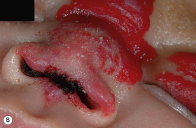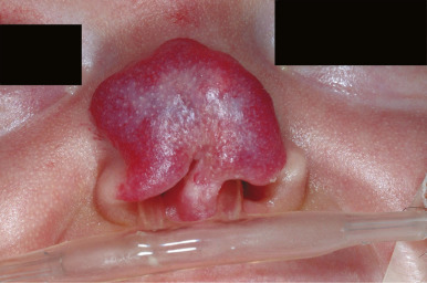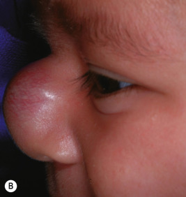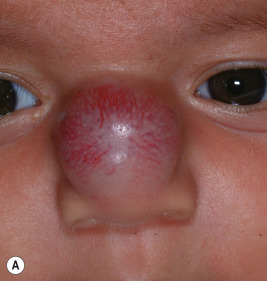 Nasal tip/bridge IHs ( Fig. 12-29 ) often require specialist consultation because of their propensity to distort the nasal anatomy ( Fig. 12-30 ), resulting in permanent disfigurement. Slow involution of these lesions may pose significant psychosocial distress to the older child, and the splaying of nasal cartilage combined with redundant fibrofatty tissue after involution may result in the “Cyrano” nasal deformity ( Fig. 12-31 ). The nasal crease sign is a linear, gray atrophic crease in the inferior columella that may occur with segmental facial IH involving the nose ( Fig. 12-32 ) and that may portend imminent cartilage destruction and nasal collapse. It is for reasons such as these that therapy is often indicated for nasal IH.
