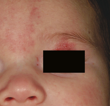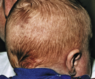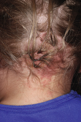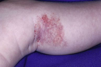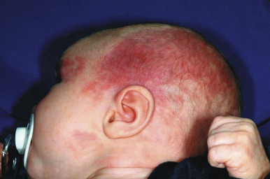 The salmon patch (nevus simplex) is the most common vascular lesion of infancy. It occurs in 30% to 40% of all newborns and appears as a flat, dull pink, macular lesion on the posterior neck and scalp ( Fig. 12-54 ), glabella ( Fig. 12-55 ), forehead, upper eyelids, and occasionally the nose or nasolabial regions. When seen on the nape of the neck, it is commonly referred to as a stork bite and when on the forehead/glabella, as the angel kiss. Although the salmon patch represents the most common form of capillary malformation, it is felt by many to be a form of persistent fetal circulation rather than a true malformation. Although older nomenclature may include salmon patch under the category of PWS, this terminology should not be used because these lesions have distinct natural histories and differing significance in terms of potential syndrome associations. Salmon patches are usually isolated lesions without other associated findings. Nuchal or occipital stains may occasionally develop an associated overlying dermatitis ( Fig. 12-56 ), which may respond to topical corticosteroids or PDL treatment, if necessary.