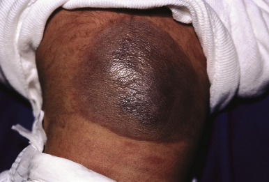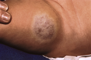 Kasabach–Merritt phenomenon (KMP; also known as Kasabach–Merritt syndrome ) is characterized by thrombocytopenia (owing to platelet trapping), coagulopathy, and microangiopathic hemolytic anemia in association with a rapidly enlarging vascular lesion. It was traditionally felt to be a complication of IH but is now known to be associated with vascular tumors other than IH, namely KHE and tufted angioma. These lesions have characteristics that clinically distinguish them from hemangiomas (see below). KMP occurs most often within the first few weeks of life and presents with sudden enlargement of the vascular lesion, ecchymosis, prolonged bleeding, epistaxis, hematuria, or hematochezia. The cutaneous lesions show purpura, edema, induration, and an advancing ecchymotic margin ( Fig. 12-45 ). In addition to thrombocytopenia, other laboratory findings include anemia, hypofibrinogenemia, elevated D-dimers, fragmentation of erythrocytes on manual smear, and prolonged coagulation studies. The mortality rate is high, from 10% to 30%.