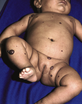 Diffuse neonatal hemangiomatosis (disseminated neonatal hemangiomatosis) describes patients with multiple cutaneous lesions in conjunction with extracutaneous organ involvement. It must be differentiated from benign neonatal hemangiomatosis, in which the infant has multiple cutaneous lesions without any symptomatic visceral lesions or complications. Patients with either type of hemangiomatosis may have only a few or up to hundreds of cutaneous IHs ( Figs. 12-43 and 12-44 ). Some authors advocate for the terminology multifocal IH with or without extracutaneous disease, noting that many cases reported in the literature as diffuse neonatal hemangiomatosis may actually represent other entities such as multifocal lymphangioendotheliomatosis with thrombocytopenia (MLT) (see later this chapter).