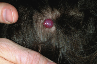 Pyogenic granuloma (PG) is a common acquired vascular lesion of the skin and mucous membranes in infants and children. It presents as a bright red to red-brown, raised, slightly pedunculated or sessile papulonodule ( Figs. 12-48 and 12-49 ). The base of sessile lesions may reveal a peripheral collarette of scale ( Fig. 12-50 ). Although its appearance is usually solitary, PG may occasionally present as several lesions. In addition, secondary PG-like proliferations may occasionally occur on the surface of an existing PWS ( Fig. 12-51 ), usually in the older child or young adult. Multiple, or “agminated,” PG lesions have been reported in the setting of preexisting congenital vascular stains as well as in areas of preceding scalding burns. PG is prone to superficial ulceration and bleeding, which usually brings the patient to medical attention. The pathogenesis of PG is unknown. Despite the name, the lesions are not considered infectious. Although they may occur on any skin surface, they most commonly appear in areas subject to trauma, especially the hands, fingers, forearms, face, and occasionally the mucosal surfaces of the mouth. They have been described on the penile shaft after circumcision. Although histologic evaluation is usually not necessary for diagnosis, pathologic examination reveals changes similar to those of a well-circumscribed IH.