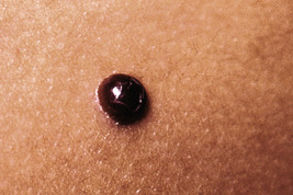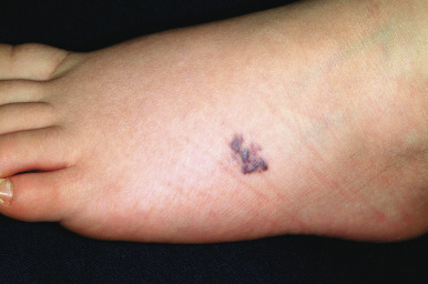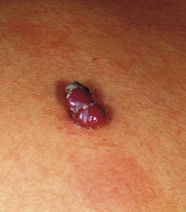Solitary glomus tumors, which represent 90% of all lesions, do not appear to have a familial tendency. They are characterized by the clinical triad of paroxysmal pain, local tenderness, and cold sensitivity. Solitary lesions present as a blue-red nodule ( Fig. 12-52 ) from 1 mm to several centimeters in size. They most often appear on the upper extremities, particularly the nailbeds, and occasionally on the lower extremities, head, neck, or penis. Although the etiology is unknown, some lesions appear to be associated with previous trauma. The differential diagnosis of a solitary glomus tumor includes VM, blue nevus, melanoma, dermatofibroma, and leiomyoma. If occurring in an infant, hemangioma of infancy may also be in the differential.